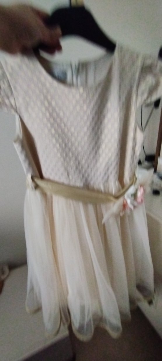 Bej renkli, V yakalı ve pilili detaylara sahip kız çocuk elbisesi. Askılı kollu ve yumuşak sentetik kumaştan, bohem tarzda.