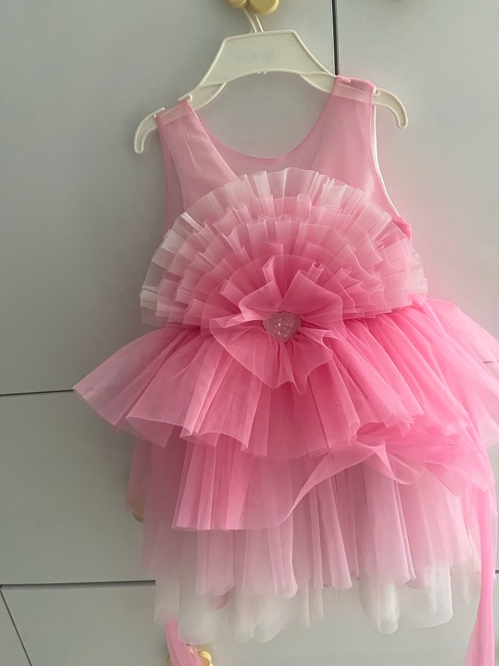 Pembe, kolsuz, kat kat fırfırlı ve vücuda oturan tasarıma sahip, yumuşak sentetik kumaştan yapılmış kız çocuk elbisesi.