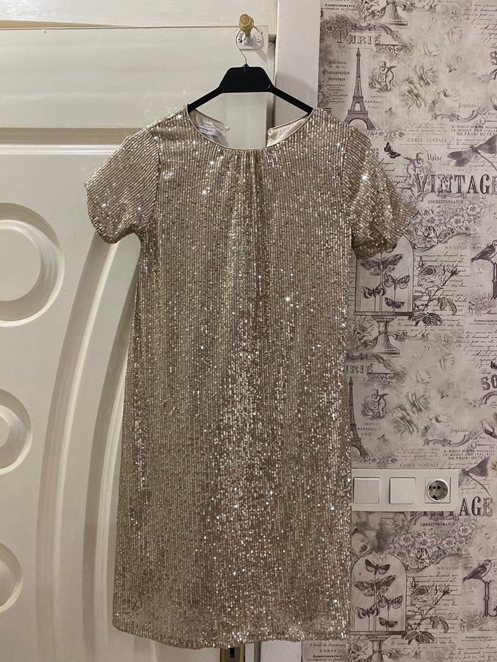 Altın renkli, payetli midi elbise, kısa kollu ve yuvarlak yakalıdır. Bol kesimi ve parlak desenleriyle dikkat çeker. ✨bir defa kullanıldı yepyeni