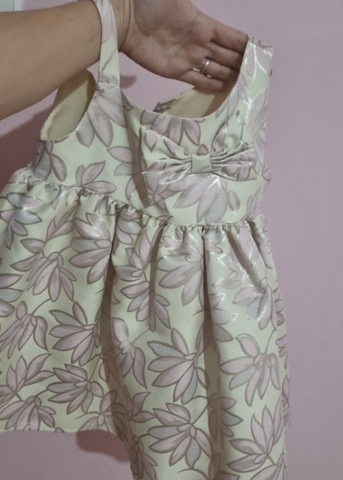 Sıfır ayarında, altında pamuklu keten kumaş astarı var. Yansımalı soft sarı ve toz pembe yaldız parıltılı kumaşı olan elbisedir. Önünde fiyonk var. Boyu çok kısa değildir.