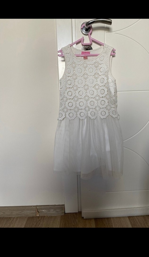 6-7 yaş, temiz sorunsuz. yırtık sökük yok. Kolsuz, beyaz dantel işlemeli, fitted örme üst kısmı ve yumuşak tül etek kısmı ile bohem ve klasik şıklık sunan kız çocuk elbisesi.