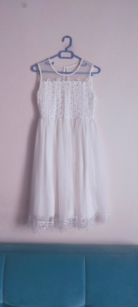 Bir kere bir yakinimizin düğününde giyildi,sıfır ayarında,sorunsuz,LCW ürünüdür,incilerini kendim işledim, tamdır,iki kat tül ve penye icligi vardır,esnektir,koltuk altı uçtan uca 38cm,boyu 94cmdir,hem gelinlik hem elbise olarak kullanılanabilirDolabimdaki kız çocuk bolero ile kombinleyebilirsiniz,11-12-13 yaşlara uygundur