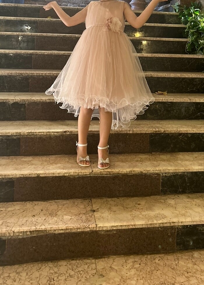 1 kez giyildi. Temiz -5-6 yaş elbise. Öndeki çiçek figürü dahil. Eteğine kuyruk ya da pelerin olarak kullanabileceğiniz tülü var. İçinde astarı var. Koltuk altı ölçüsü 29-30 cm. İki omuz arası 25 cm. Bel 30 cm