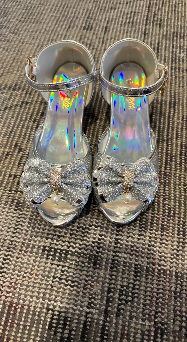 Kız çocukları için parlak gumuş renkte, fiyonk ve inci detaylı topuklu, çok sik ayakkabi