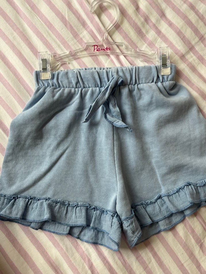 Açık mavi denim kumaştan, volan detaylı, bol kesim kız çocuk şortu. Sokak stili için uygun, hafif batik desenlidir.