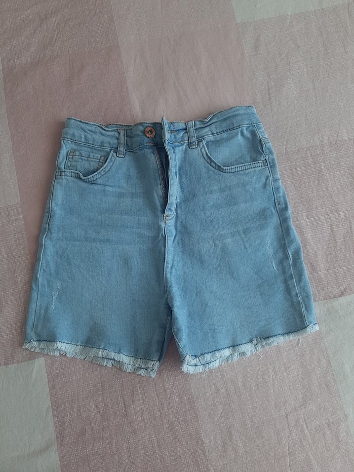 Gevşek kesim, pastel mavi renkte kısa mini denim şort, günlük rahat kullanım için uygun, kenarları hırpani detaylı.