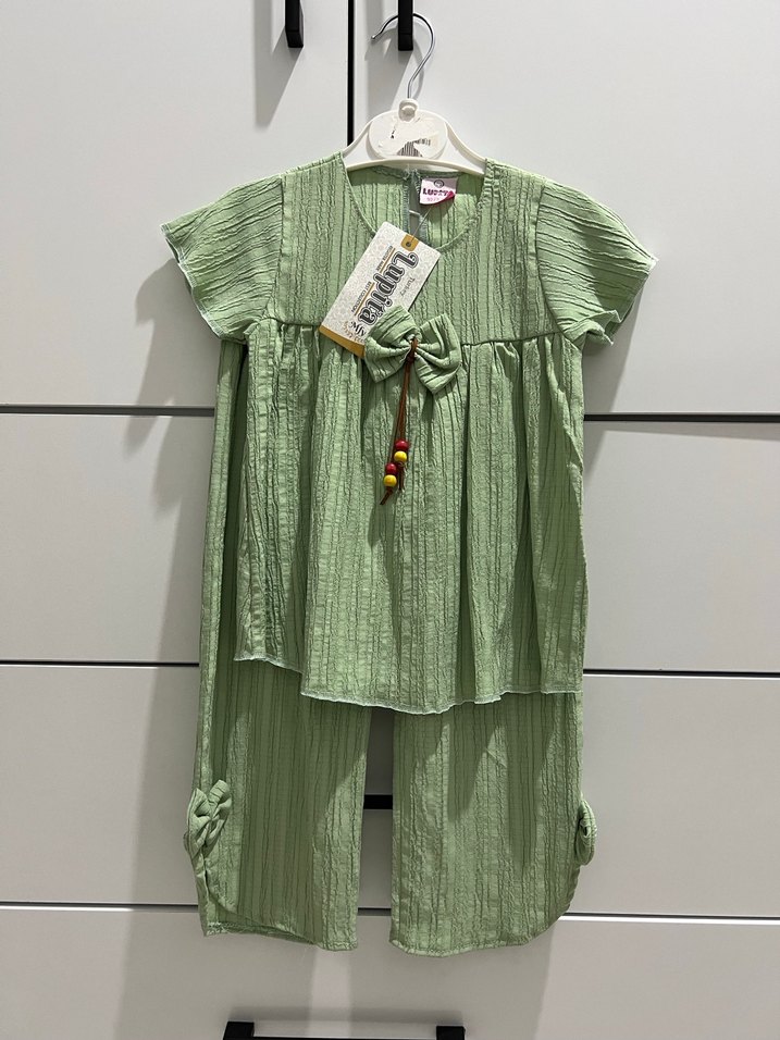 Keten kumaştan, kısa kollu, bol kesim yeşil kız çocuk elbisesi. Pliseli ve nakışlı detaylarla bohem tarz sunar.