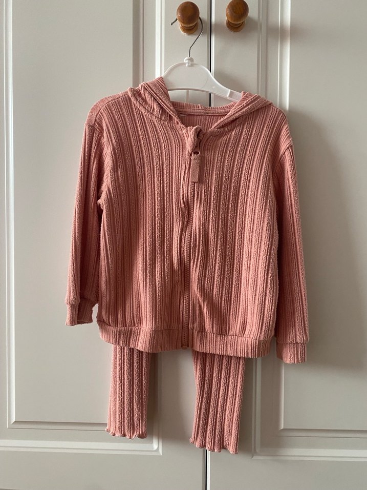 Pembe pastel tonlarda, uzun kollu örgü bebek kız takımı. Kapüşonlu üst ve uyumlu pantolon, desensiz.
