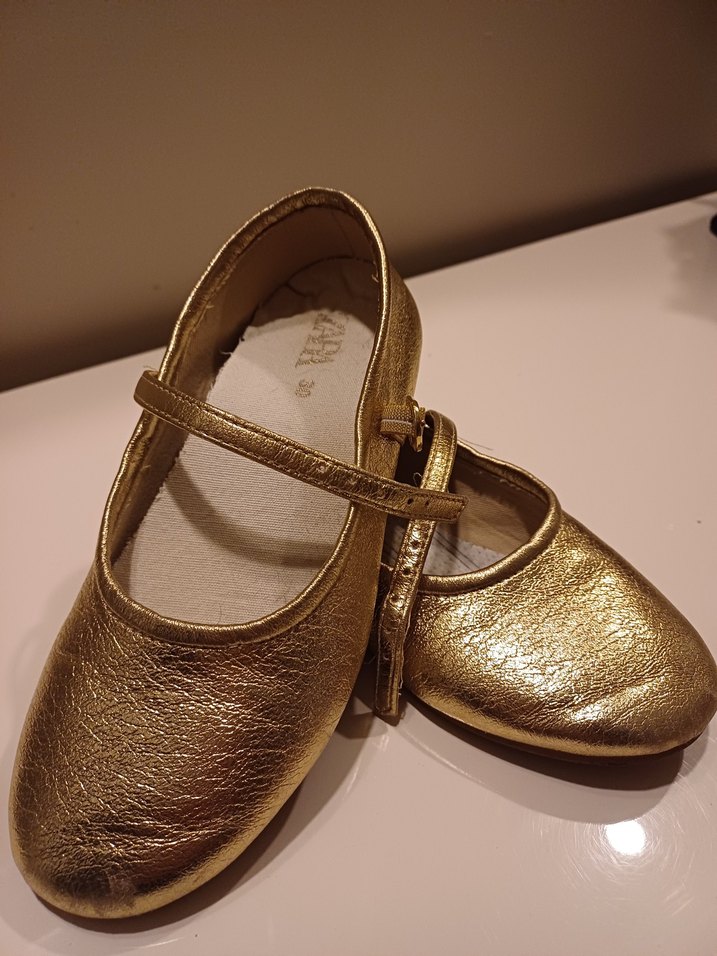 Kız çocukları için parlak altın renkli deri babet ayakkabılar, toka detaylı ve klasik tasarımlı.