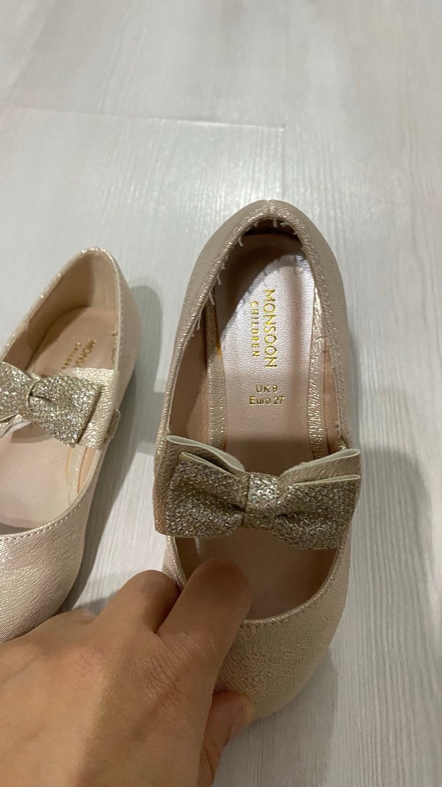 Parlak altın renkli, yılan derisi desenli kız çocuk babet ayakkabı. Kauçuk malzemeden, fiyonklu ve modern klasik tarzda, Monsoon markası.
