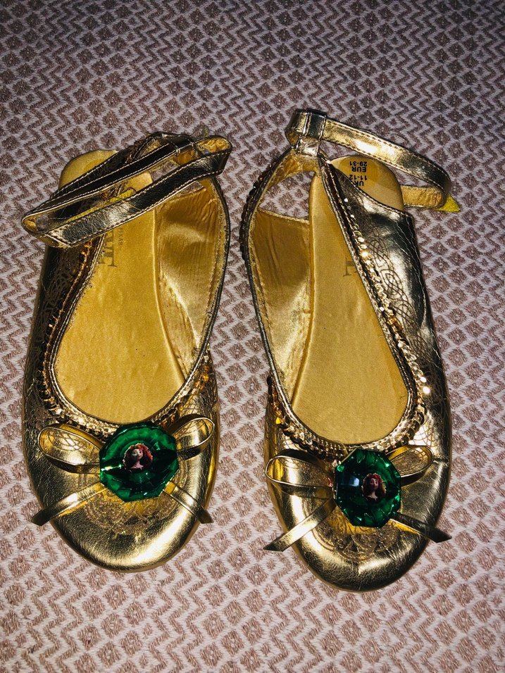 Kız çocukları için parlak altın renkli, yılan derisi desenli, tokalı ve yeşil taş detaylı balerin ayakkabısı. Kauçuk malzemeden üretilmiştir. Giymeye engel kusuru yoktur