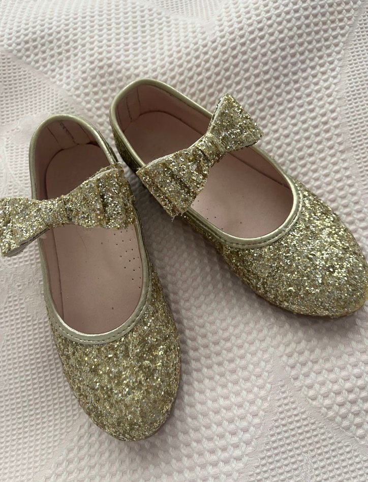 Kız çocukları için altın parlaklıkta, modern klasik tarzda, lastik tabanlı ve fiyonk detaylı babet ayakkabı. ✨29 numara sadece topuk kısmın ucunda hafif soyulma mevcut detaylı fotoda var.