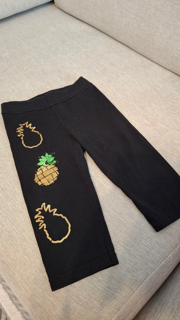 Koyu renkli örme kumaştan, baskılı ananas desenleri ve altın renkli pul detaylı, kız çocuklar için dar kesim tayt. MARKA TEMSİLİ SORUNSUZDUR