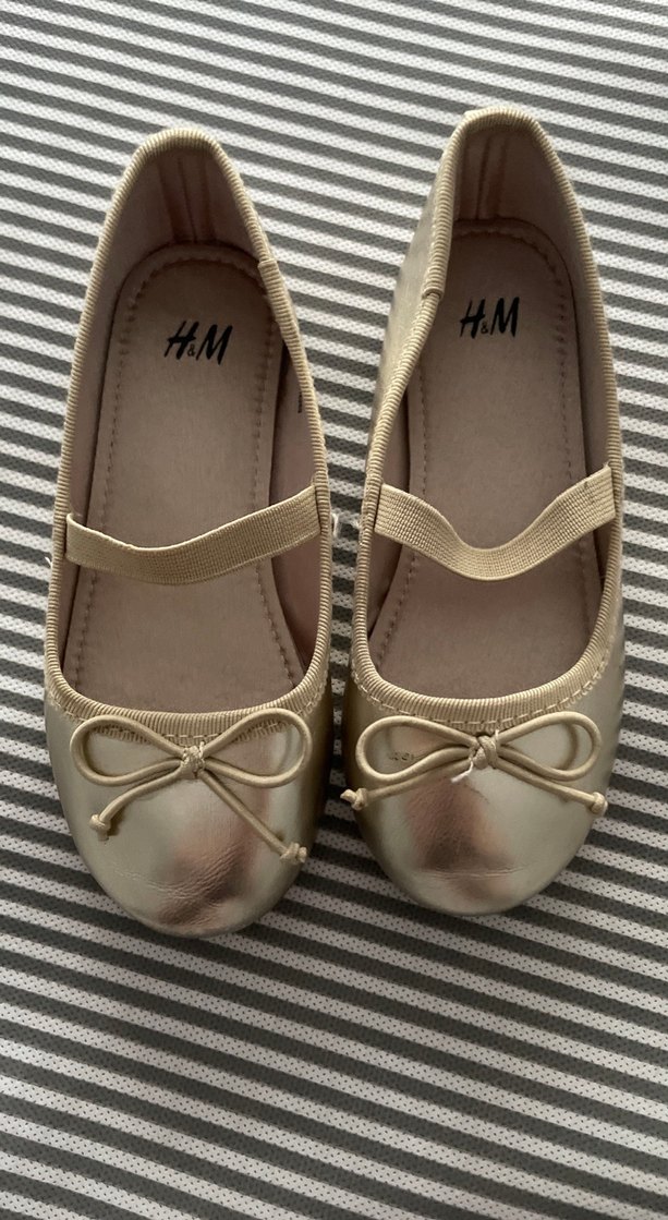 Kız çocukları için altın renkli, tokalı babetler. Parlak yüzeye sahip, lastik malzemeden üretilmiş, desen içermeyen modern klasik tarzda. Marka: H&M.