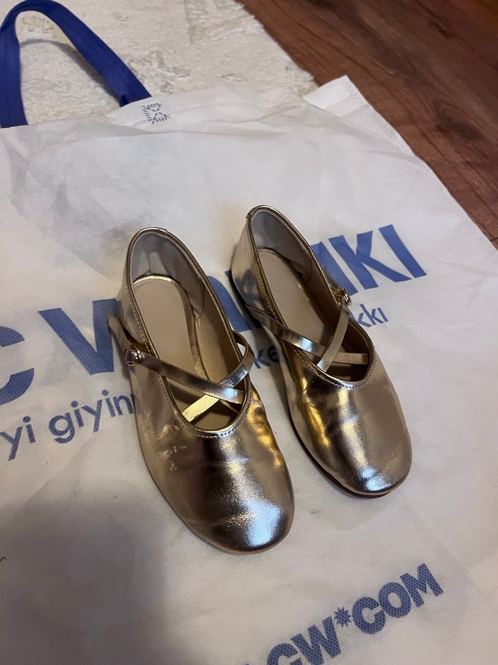 Kız çocukları için parlak altın renkli, tokalı bantlı ve kauçuk malzemeden yapılmış babetler, şık sokak stili için uygundur.