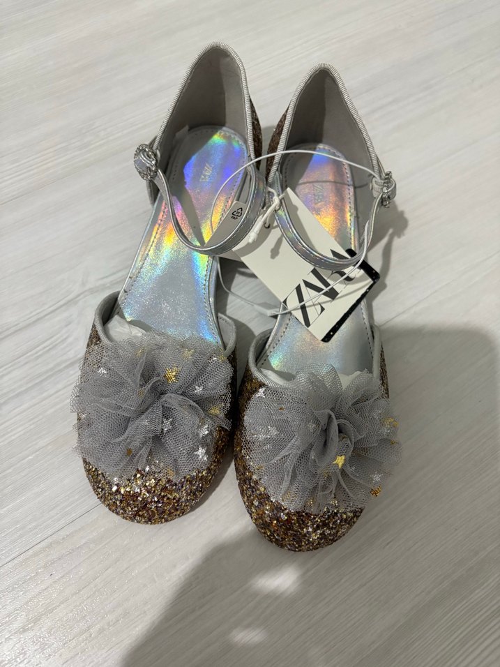 Altın simli, gri tül fiyonk ve yıldız detaylı kız çocuk babet ayakkabı, kauçuk tabanlı ve baskılı desene sahip, modaya uygun sokak stili.✨