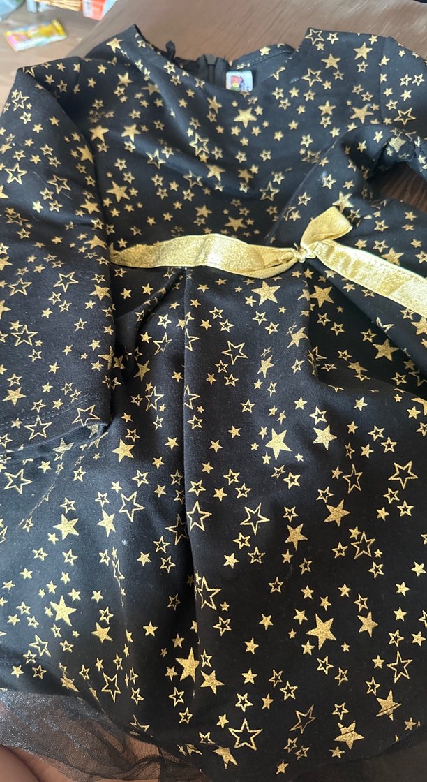 Bu kız çocuk elbisesi, parlak altın yıldız desenli siyah kumaştan, uzun kollu yakalı ve altın kurdele detaylıdır. Altında tül detaylı