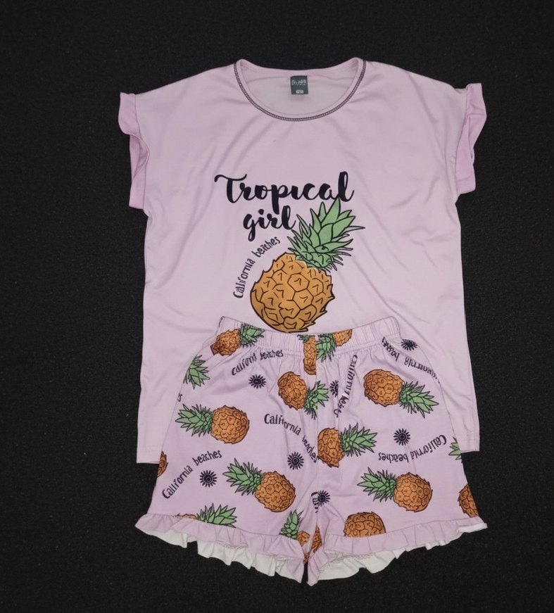 Pembe renkli, bol kesim kısa kollu üstü ananas baskılı ve fırfırlı, eşleşen baskılı şortlu kız çocuk pijama takımı.