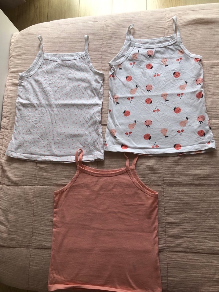 Kız Çocukları için ince askılı, beyaz ve desenli iki adet, bir adet şeftali renkli olmak üzere üç adet hafif atlet. Rahat ve yumuşak kumaş.