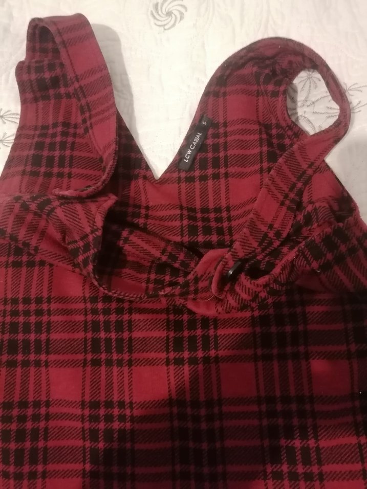 Bordo ve siyah kare desenli, düğmeli askılı halter yaka elbise , rahat ve günlük sokak stili için uygun.