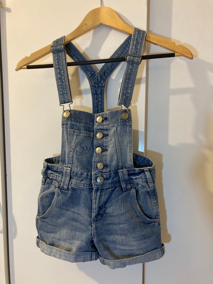 Mavi denimden yapılmış, tokalı askıları ve düğme detayları var. Neredeyse hiç kullanılmadı. İlgilenirseniz tam ölçülerini verebilirim.