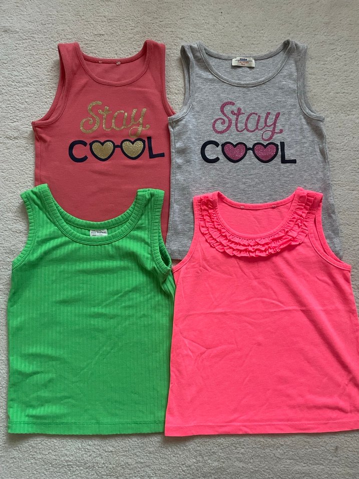 Kız çocukları için renkli, askısız ve dar kesim sentetik kumaş tişörtler. Bazılarında payetli 'Stay COOL' baskı ve fırfır detaylar bulunur. Trend sokak stili.