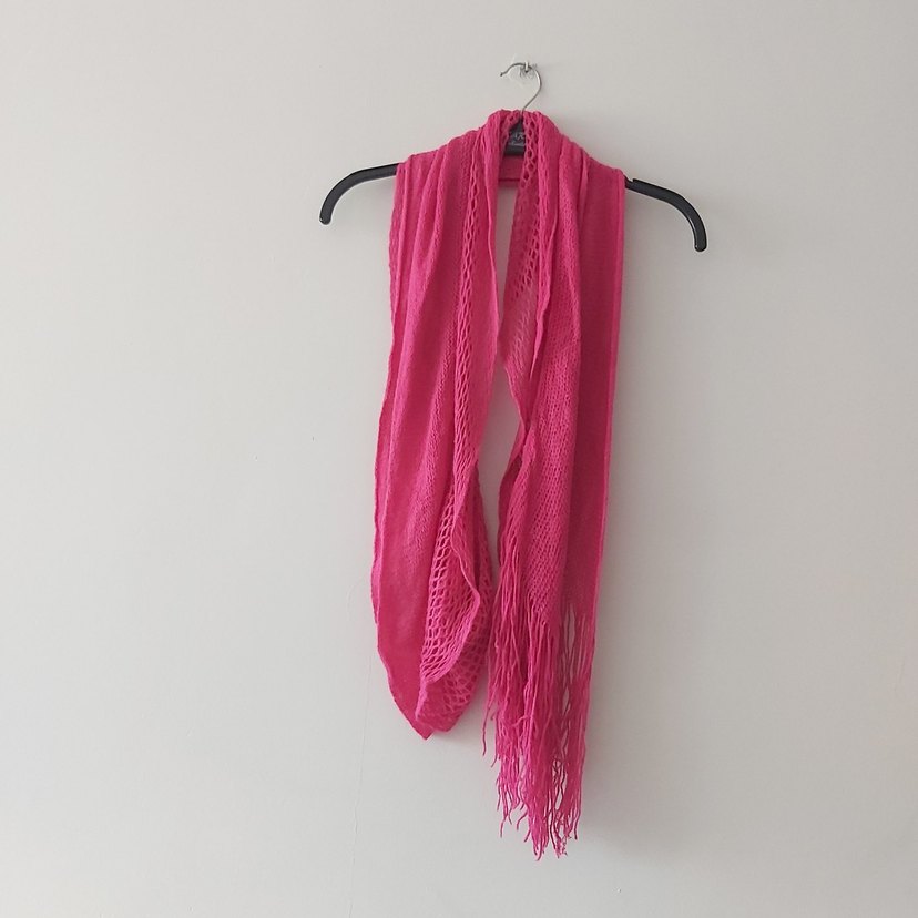 Pembe renkte, püsküllü uçlu drapeli triko şal, rahat ve renkli bohem tarz sunar. Retro ve huzurlu görünüm için uygundur. defosu yok