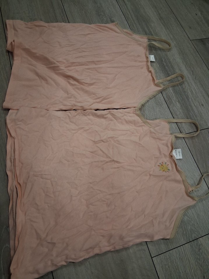 Yumuşak, rahat kumaştan yapılmış, pastel bej renkli iki adet kız çocuk askılı atlet. Birinde yakada küçük bir güneş detayı var.