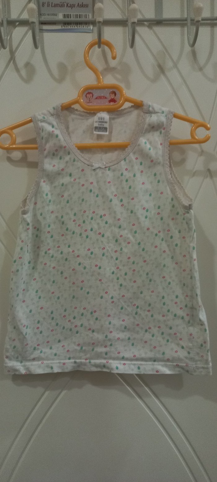 Yumuşak beyaz kumaş üzerine pastel renklerde küçük çiçek desenleri bulunan çocuk atleti