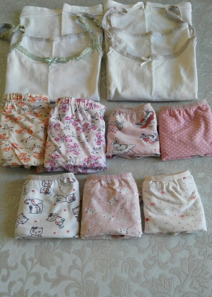 Kız çocuk atlet külot takım ( 9 adet).6/7/ 8 yaş .2 adet atlet ve 7 adet külot.Külotların bel ölçüleri ,2 adet: 22 cm ,1 adet :24 cm ,4 adet :25 cm .Atletlerin bel ölçüsü :37 cm .Not:1-2 külotların belinde sökülmeler olmuş olup dikilmiştir .ürünler temizdir, kullanılmıştır.