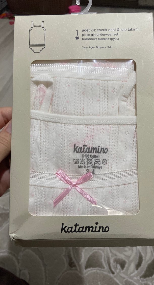 Beyaz, nakışlı ve pastel detaylı örgü bebek body; askılı kollu ve tekne yaka. Katamino markasına ait, yumuşak pamuktan üretilmiştir.