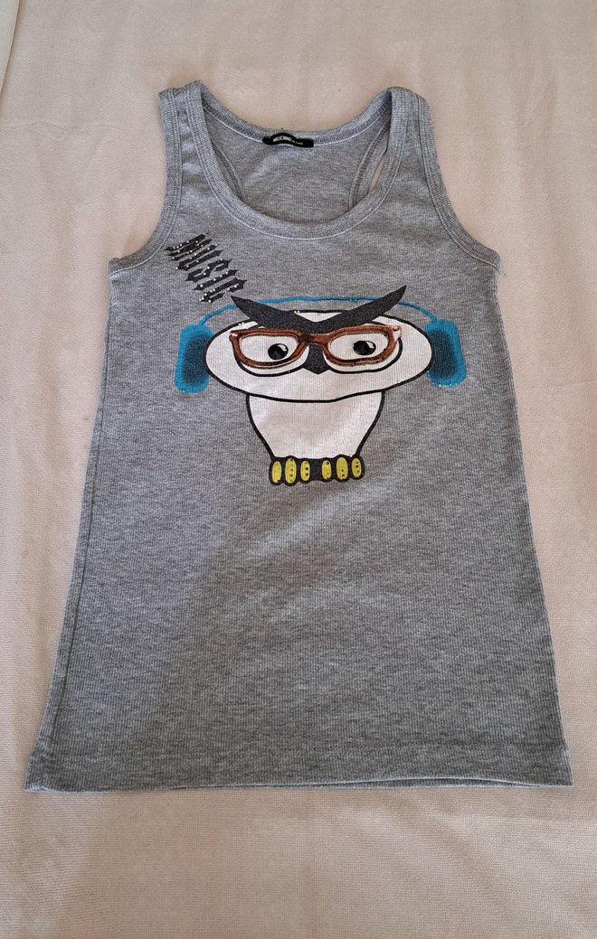Pamuklu, gri renkli, baskılı baykuş figürlü, kolsuz ve vücuda oturan kız çocuk atleti,