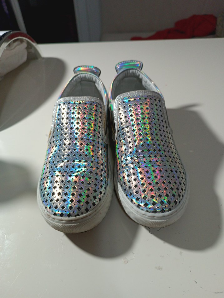 küçükken kizlarima çok severek almıştım sadece iki sefer kullandı kaldırdım, durmadan kaynaklı kenarlarında sarılık mevcut ama kullanmaya engel değil,çok tatlı hologram renkli bir ayakkabı 32 numara diğer ürünlerime bakmayı unutmayın ❤️