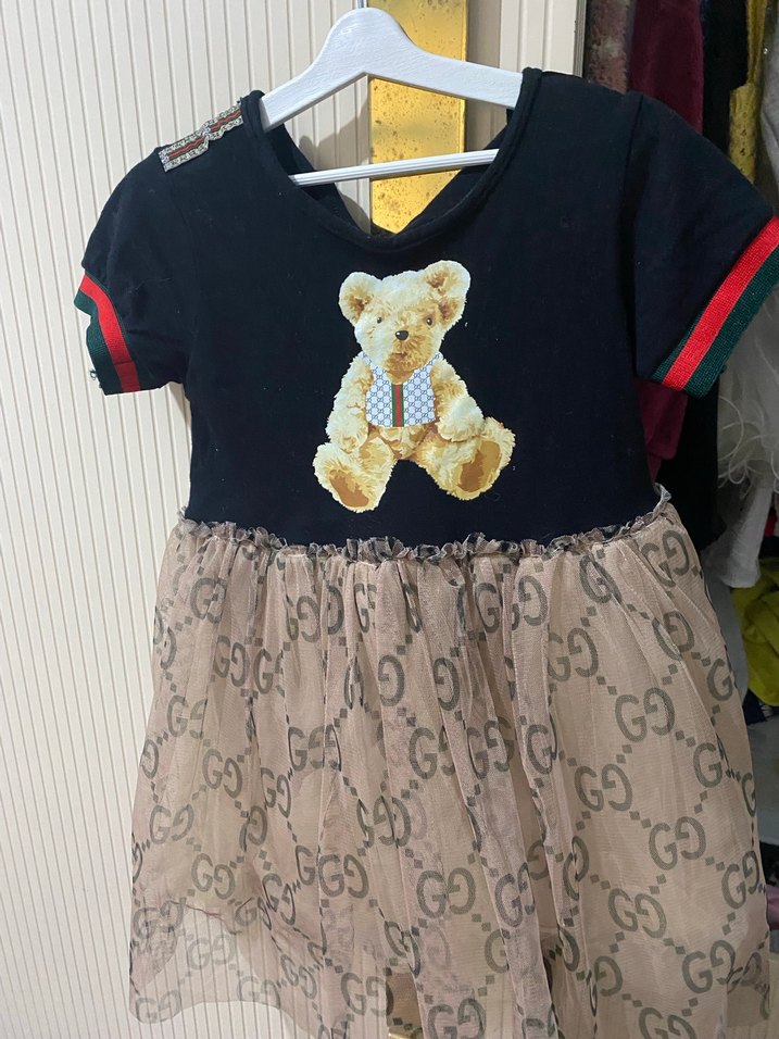 Kısa kollu, yuvarlak yakalı ve bol kesim kız çocuk elbisesi. Koyu renk üstte ayıcık baskısı ve desenli kahverengi fırfırlı etek kısmı bulunur. Sentetik kumaştan üretilmiştir.