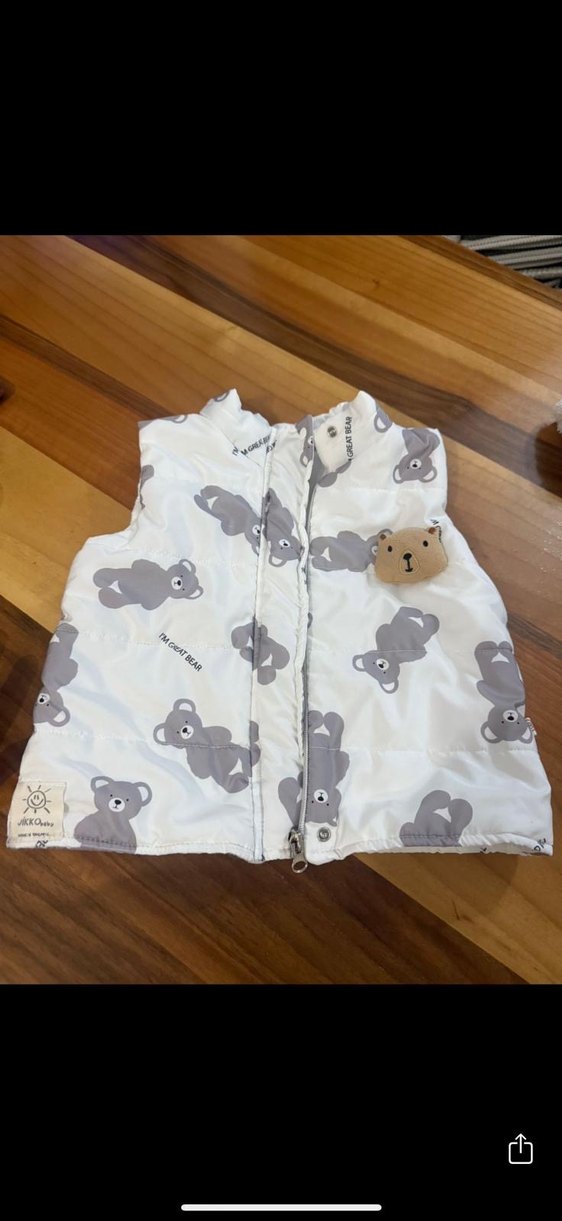 Düğmeli, kolsuz ve bol kesim yelek. Yumuşak kumaş üzerinde ayıcık desenleri bulunur. Beyaz ve gri renkler, sokak modası tarzında.