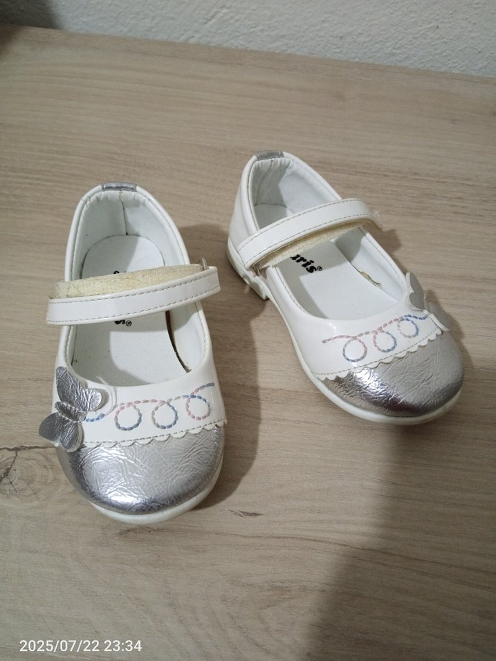 Beyaz renkli, kız çocuk babet ayakkabı. İşlemeli detaylar ve gümüş burun kısmı bulunur. Kauçuk malzemeden üretilmiştir.