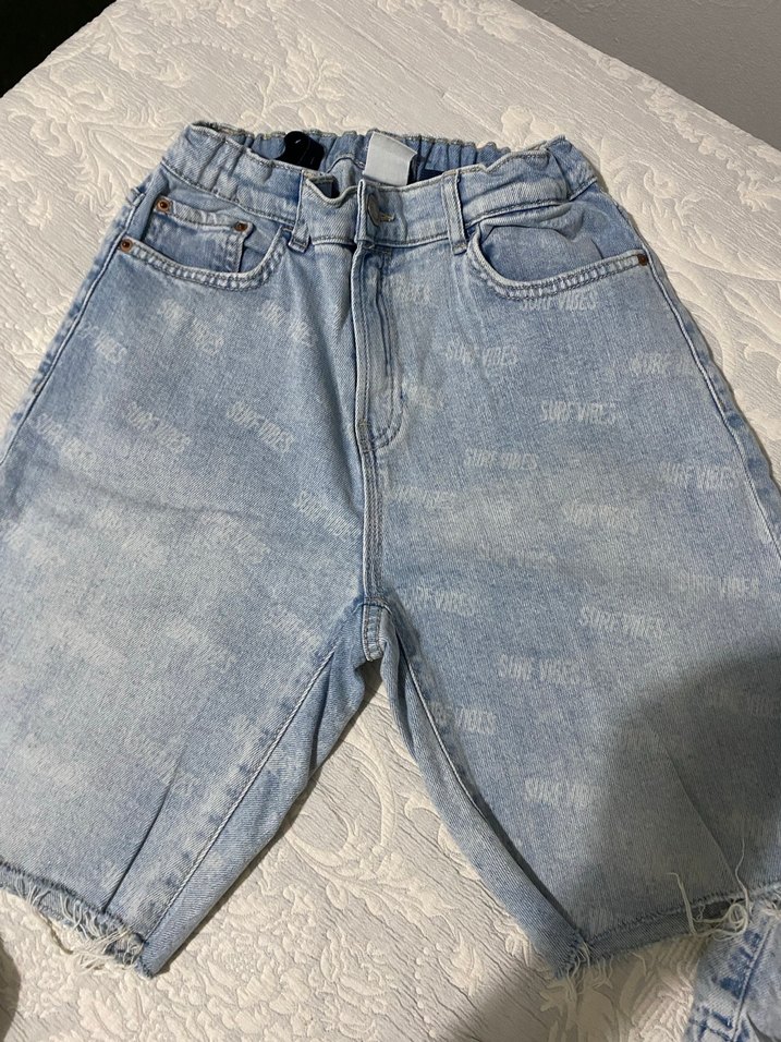 Bağcıklı detaylı, geniş kesim, mavi-gri tonlarda bağlama desenli kız kot kısa şort, rahat sokak stili için uygun.