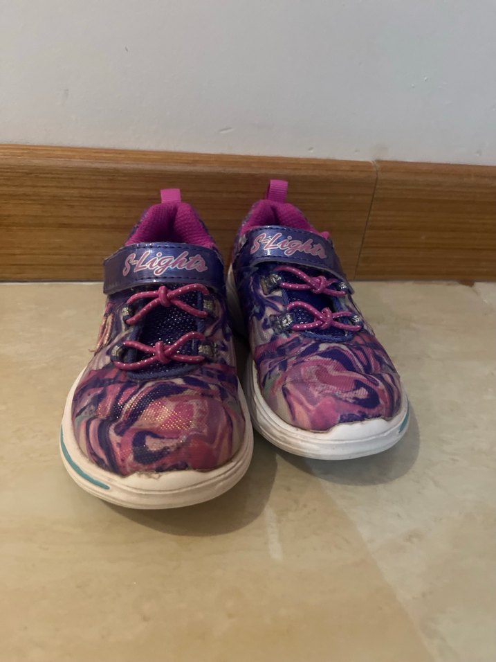 Isiklari calisiyor. 23 numara. Mor renkli bağcıksız, cırt cırtlı kız çocuk spor ayakkabısı, renkli sokak stili ve kauçuk tabanlıdır.