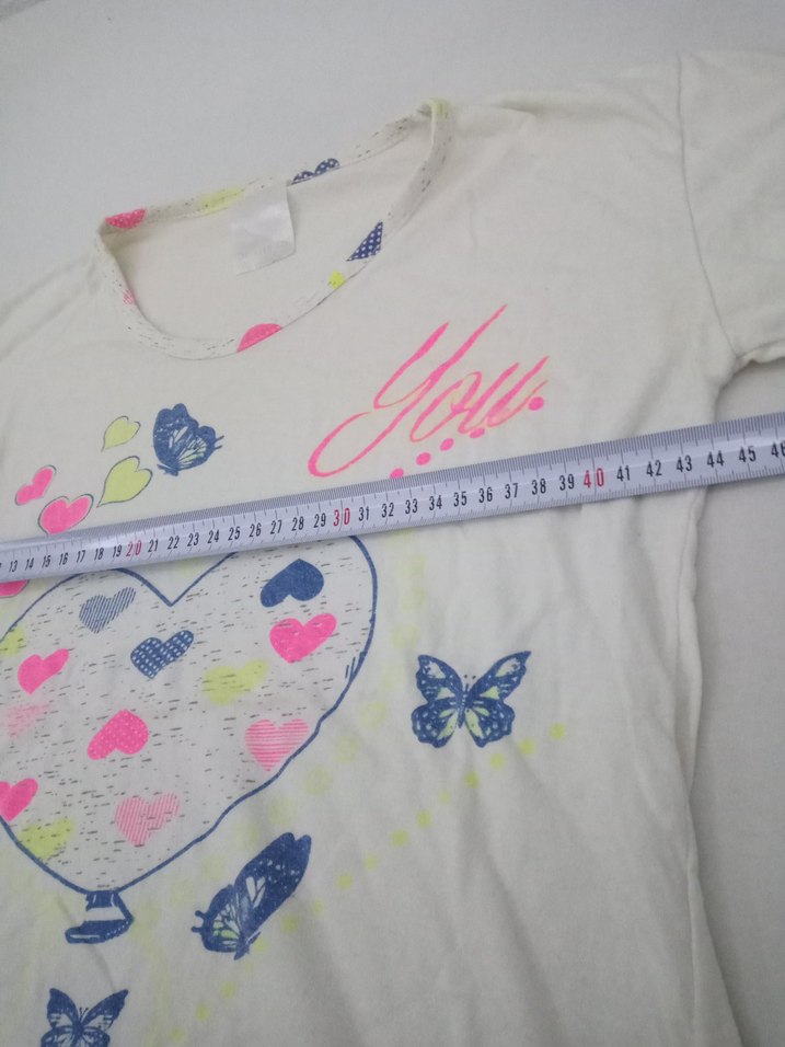 Pamuklu, bol kesim, pastel beyaz renkte kız çocuk tişörtü. Yuvarlak yaka ve kısa kollu, kalp ve kelebek baskılı bohem tarzda.