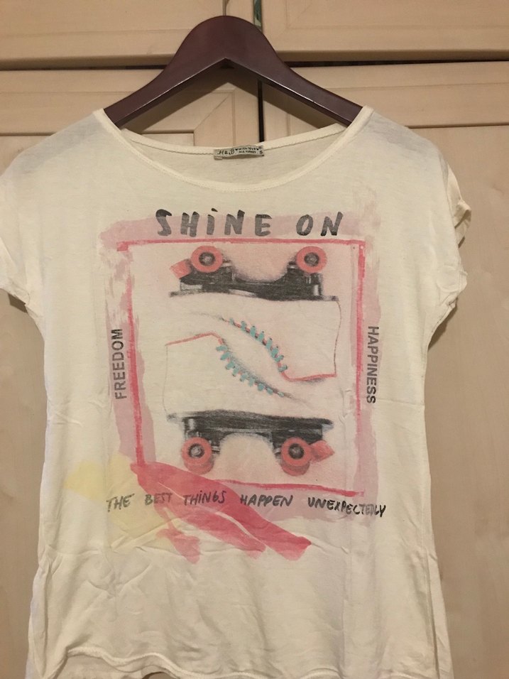Pamuklu, pastel beyaz renkte, kısa kollu, baskılı ve bol kesim kız çocuk tişörtü. Kaykay ve motivasyonel yazılarla süslenmiş, rock punk tarzında bir sokak giyimi ürünü. ✨