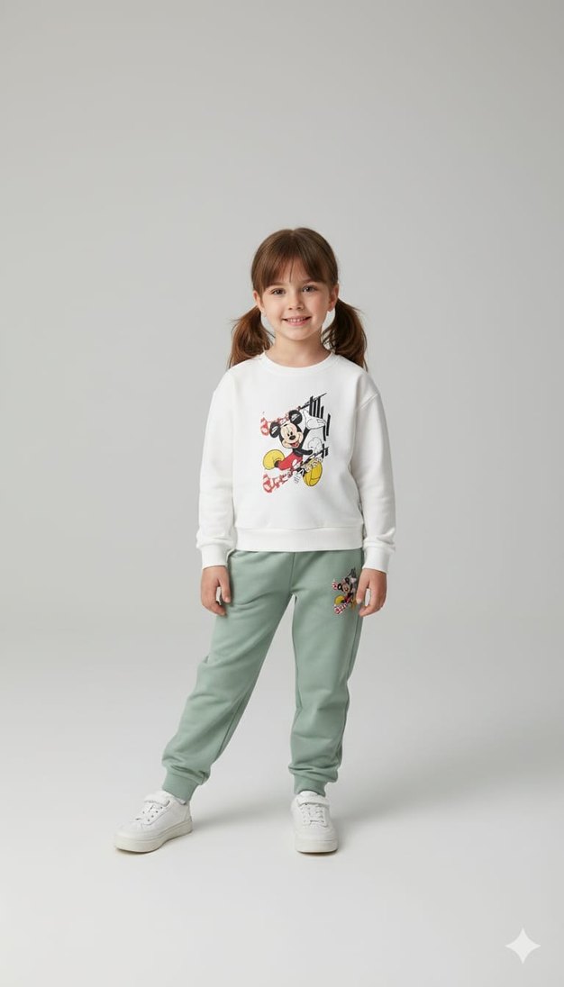 Kız çocukları için pamuklu, baskılı beyaz sweatshirt, uzun kollu ve bol kesim. Velcro detaylı, açık yeşil eşofman altıyla tamamlanır. 3-10 yaş arası mevcuttur