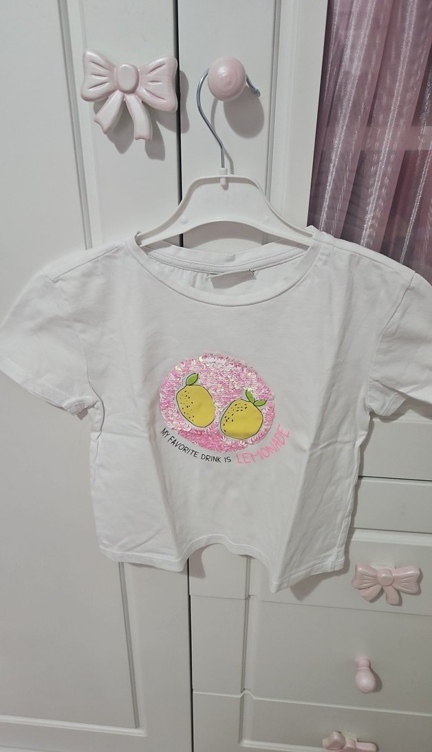 Pamuklu, yuvarlak yaka, kısa kollu kız çocuk tişörtü. Beyaz renkli, baskılı limon desenli ve salaş kesimlidir.
