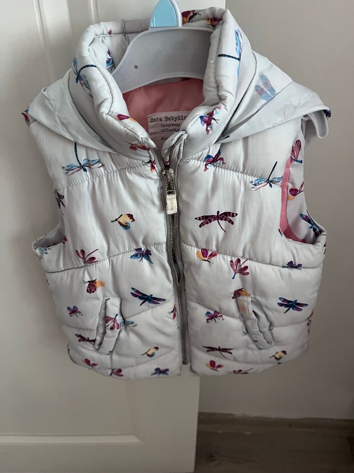 Kolsuz, straplez yaka, renkli yusufçuk ve kuş desenli, fermuarlı kız çocuk yeleği. Yalnızca fermuar sıkıntısı vardır