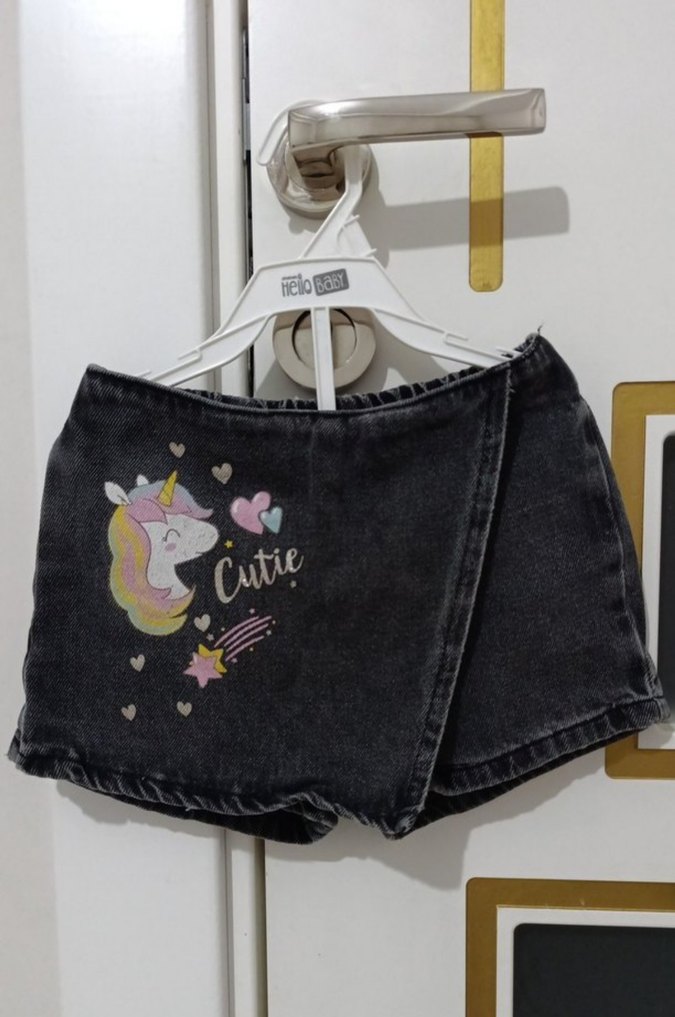 Koyu gri kot kumaştan, rahat kesimli kız çocuk eteği. Üzerinde unicorn baskısı ve 'Cutie' yazısı bulunur. Tokalı detay ile sokak modasına uygun.