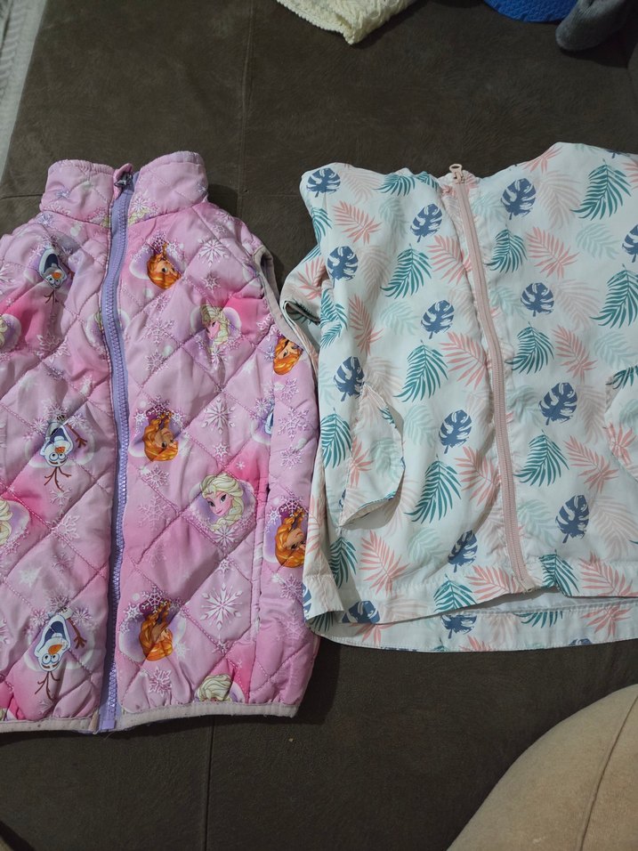 Kız çocukları için iki yelek; biri pastel tonlarda yaprak desenli, diğeri kapitone pastel pembe ve çizgi film baskılı. İkisi de fermuarlı ve dar kesim.
