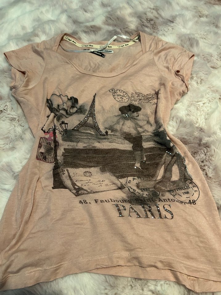 Pamuklu kumaştan yapılmış, baskılı Paris temalı, bej renkli, kısa kollu, kız çocuk için fitted tişört.