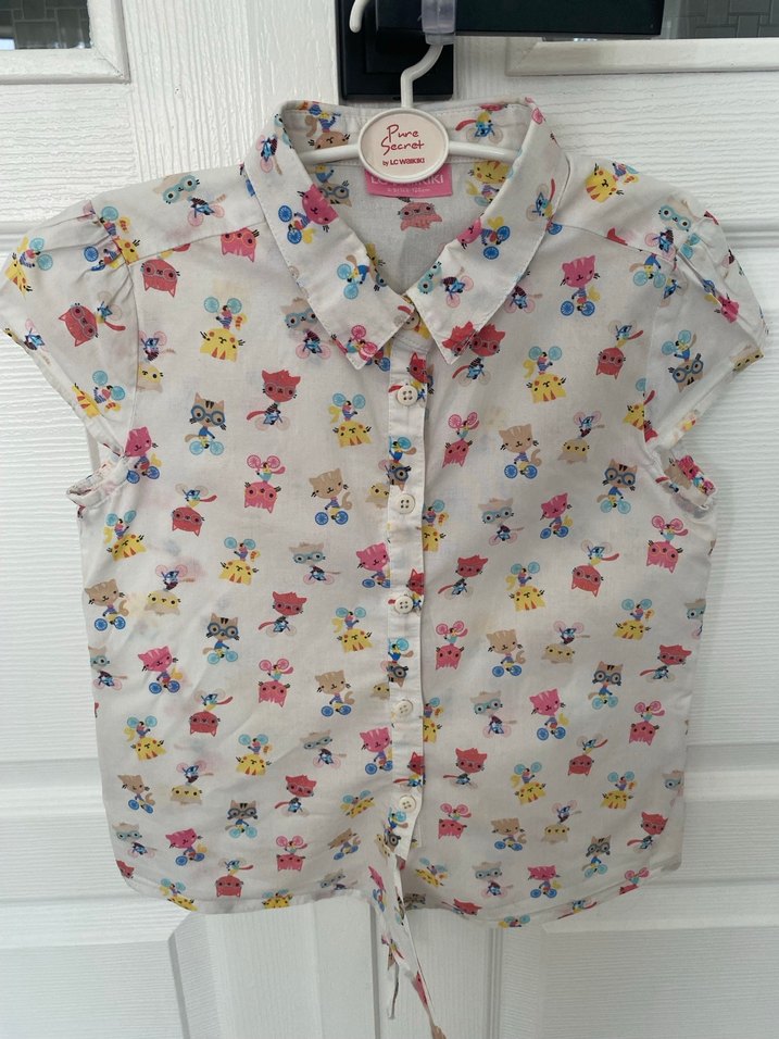 Pamuklu, kısa kollu, yakalı ve düğmeli kız çocuk gömleği. Pastel renkli sevimli baskılarla rahat ve bol kesim sunar. TEMiz durumda