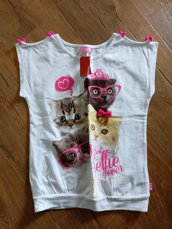Pamuklu, bol kesim, bisiklet yaka kısa kollu tişört. Üzerinde pembe detaylı baskılı kedi figürleri bulunur. Durduğu yerde leke oluşmuş yıkanınca çıkar mı bilmiyorum bilerek alım yapınız.