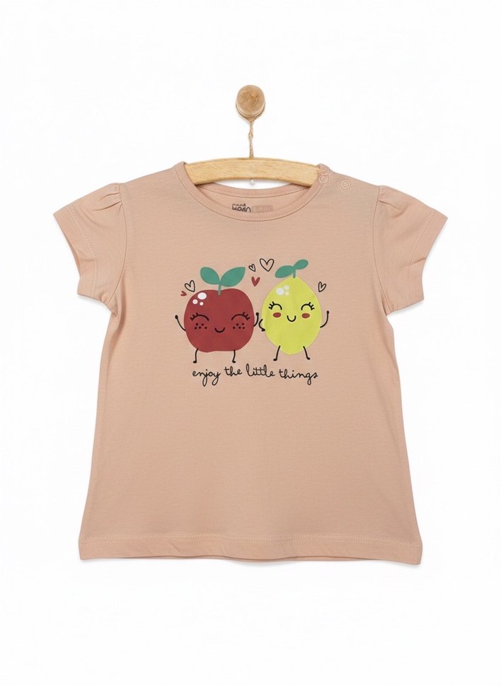 Pamuklu kumaştır. kısa kollu, yuvarlak yakalı, kız çocuk tişörtü. Üzerinde neşeli meyve baskısı ve 'enjoy the little things' yazısı bulunur. Bisiklet yaka yüzde100 pamuktur.