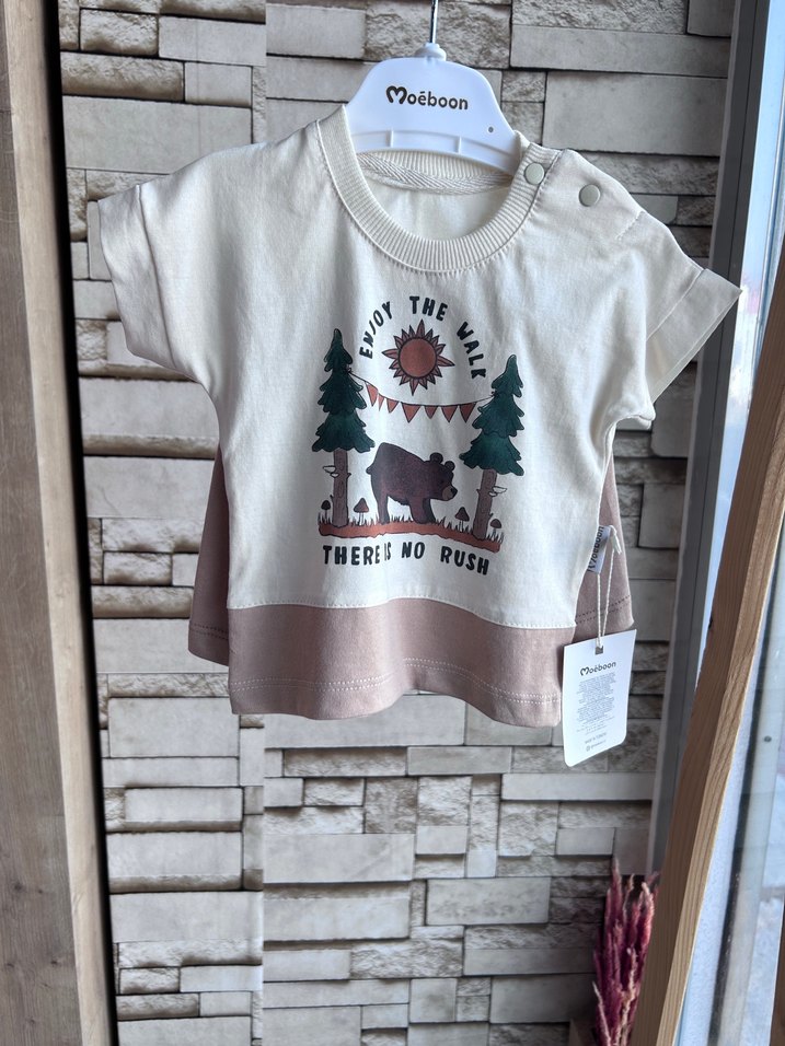 Pamuklu, kısa kollu, yuvarlak yakalı, bol kesim kız çocuk tişörtü ve şort takım. Doğa temalı baskısı ve pastel kahverengi tonlarıyla dikkat çekiyor. 6-9/9-12/12-18/18-24 ay beden seçenekleri mevcuttur.